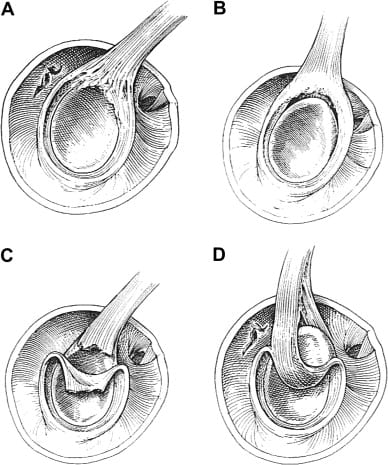 Type III labrum tear. Bucket-handle tear of the labrum with an intact biceps anchor at the glenoid rim.